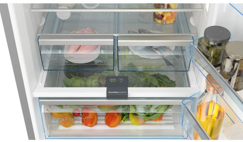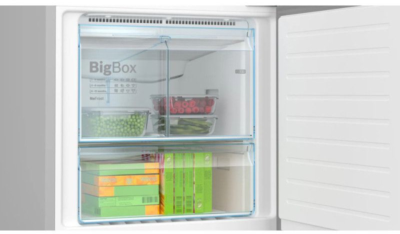 Для стабильного климата и равномерного охлаждения используется система No Frost с MultiAirflow, а также предусмотрены режимы ускоренного понижения температуры — суперохлаждение в холодильной камере и SuperFreezing в морозильной. Это удобно при больших закупках: продукты быстро выходят на нужный температурный режим.