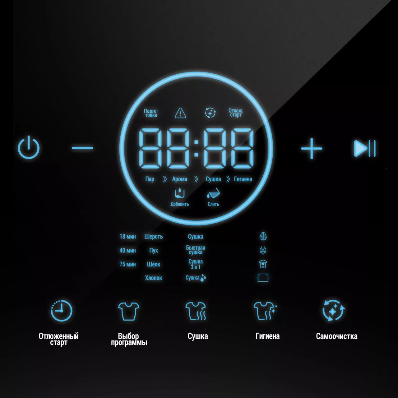 На сенсорной панели управления расположены кнопки выбора режимов, индикаторы и дисплей. Благодаря интуитивно понятному интерфейсу вы сможете легко выбрать и запустить нужный режим, контролировать время его окончания и следить за состоянием парового шкафа (индикаторы сообщат о необходимости добавить воду в резервуар, провести самоочистку и т. д.).