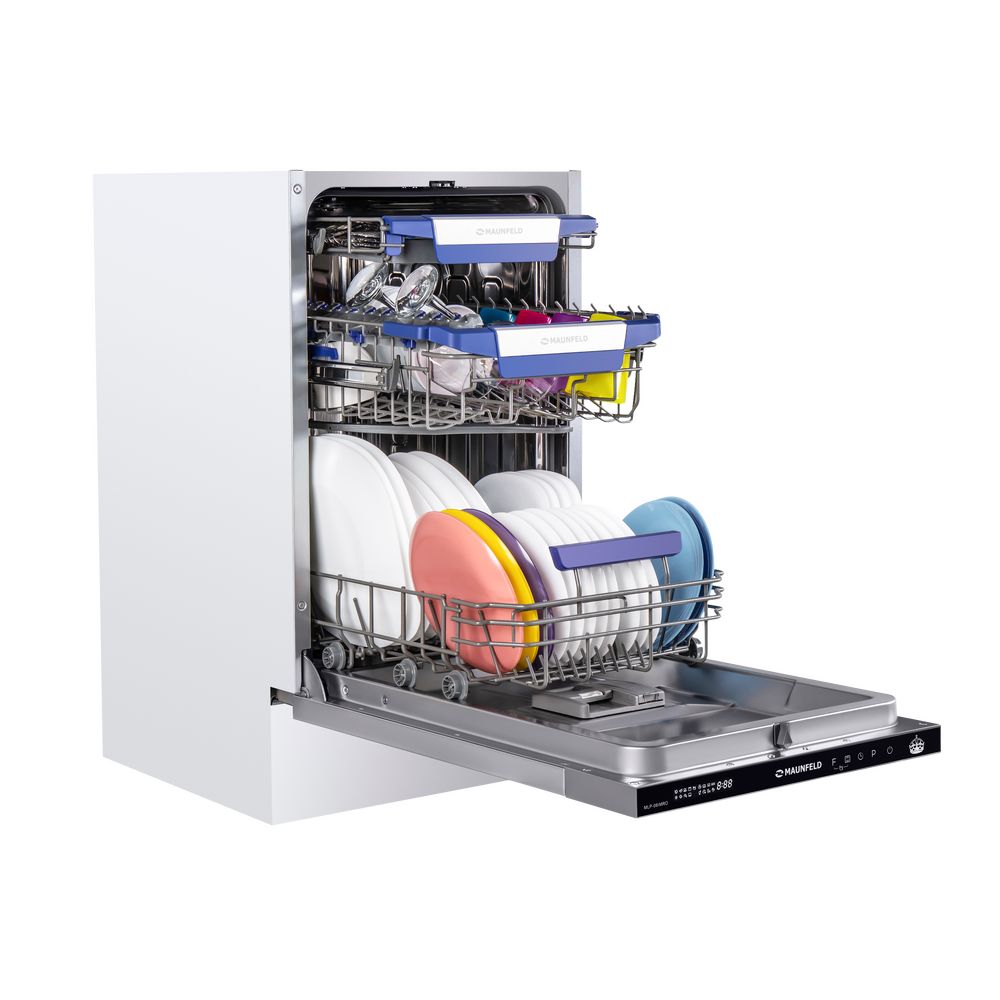 Узкая встраиваемая посудомоечная машина MAUNFELD MLP-08IMRO создана для кухонь, где важен каждый сантиметр, но не хочется жертвовать удобством. При ширине 45 см она бережно отмывает 10 комплектов, экономя место и ваше время.