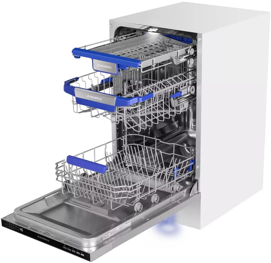 Встраиваемая посудомоечная машина MAUNFELD MLP45230 Light Beam — это узкая, но вместительная модель шириной 45 см (вместо классических 60 см). За раз она может вымыть до 10 комплектов — это оценят в больших семьях, а также те, кто любит готовить и часто принимает гостей.