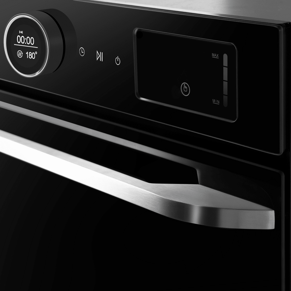 Интуитивное сенсорное управление с дисплеем делает настройку параметров максимально простой: касание — и нужный режим активирован. Тройное стекло дверцы и «холодный фронт» повышают безопасность, снижая нагрев внешнего стекла при работе духовки.