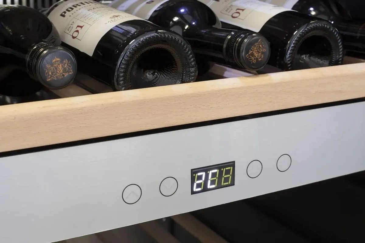 Пять съемных полок из дерева предназначены для правильного хранения вина: бутылки кладутся горизонтально (вместительность – 40 бутылок). Деревянные полки оборудованы фиксаторами от самопроизвольного выдвижения и компенсируют механические воздействия компрессора и вентилятора. Параметры холодильника задаются вручную, а также при помощи мобильного приложения «CASO-App». Возможна удаленная смена настроек из любой точки мира. Управление осуществляется при помощи двух сенсорных панелей. Регулировка температурных показателей с шагом в 1°C происходит нажатием « ∧ » и «∨». Управление внутренним освещением возможно при помощи кнопки «Свет». Встроенные светодиоды не нагреваются, и внутренний микроклимат остается максимально благоприятным для хранения бутылок.