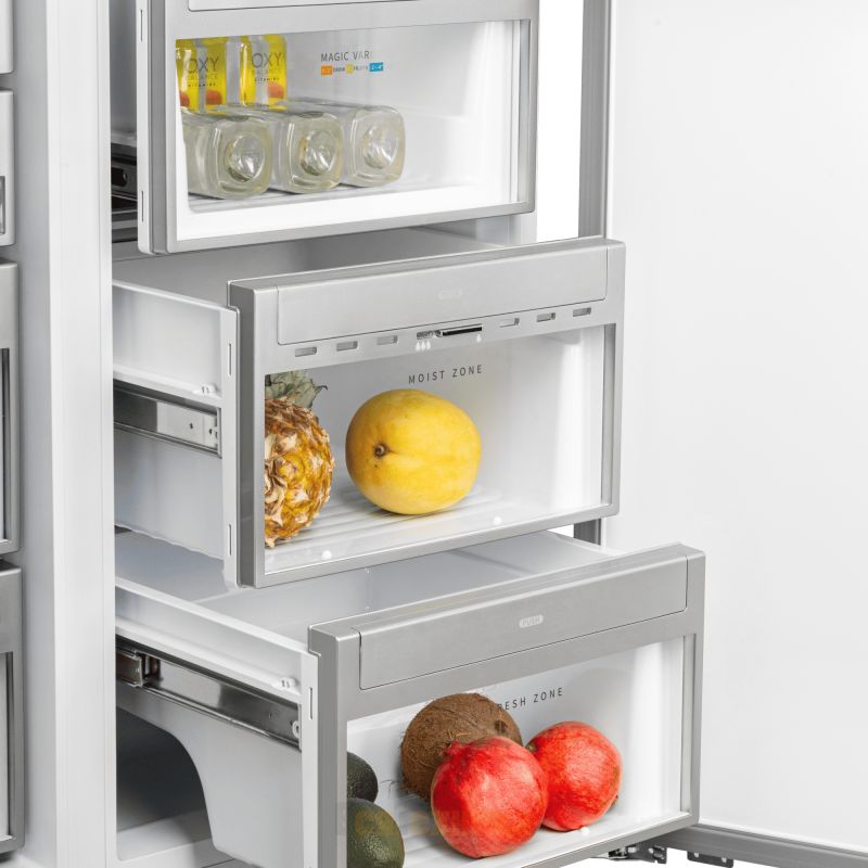 Уникальная особенность RFS 800 — наличие FLEX ZONE. Это ящик с индивидуальной зоной охлаждения, в котором можно настраивать температуру -4 °С, 0 °С или 4 °С. Такое отделение предназначено для длительного хранения самых разных продуктов: от детского питания до красной икры. Это незаменимое решение, если не хочется замораживать продукты, но употребить их вы планируете только через несколько дней. В зависимости от выбранной температуры во FLEX ZONE меняется подсветка: она может быть оранжевой, зеленой или голубой.